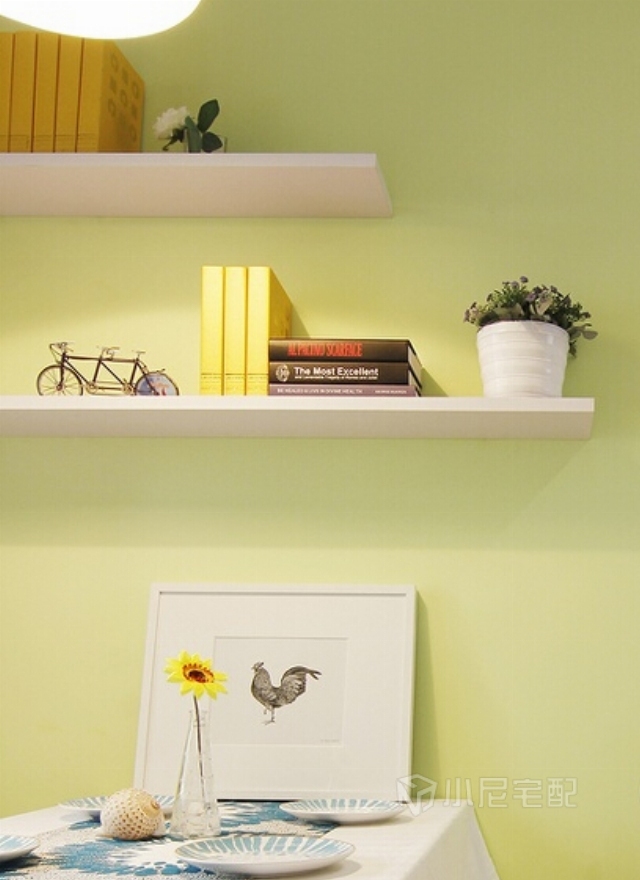 餐廳背景墻使用健康的黃綠色,整個(gè)空間明亮簡潔。