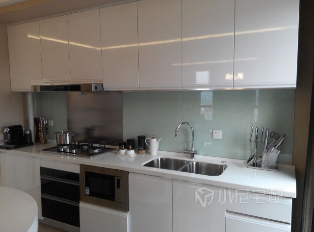 廚房一角,烤漆整體廚房,背漆玻璃加不銹鋼板的中空設計體現出年輕人的時尚