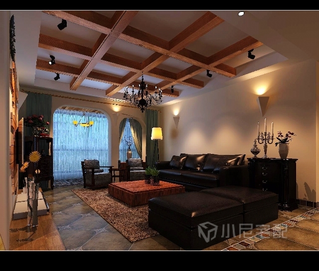 客廳頂部的設計與家具相互照應,完美結合