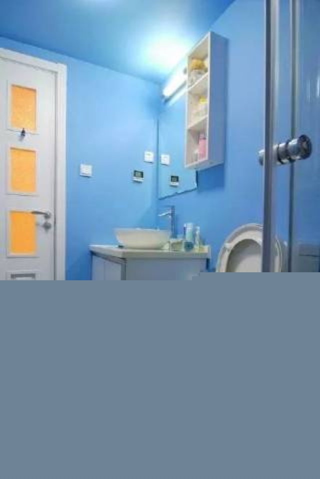 衛生間的墻壁是藍色的,顯得干凈整潔一些,洗手池上方還有一個放置洗漱用品的小架子,物品的拿取非常方便奧。