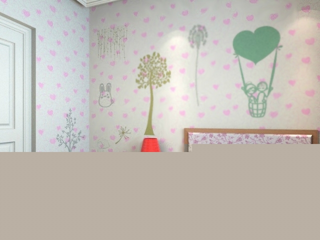 粉色心形墻紙給人一種清新可愛的效果,墻上的印畫將兒童房的浪漫氣氛烘托的淋漓盡致。