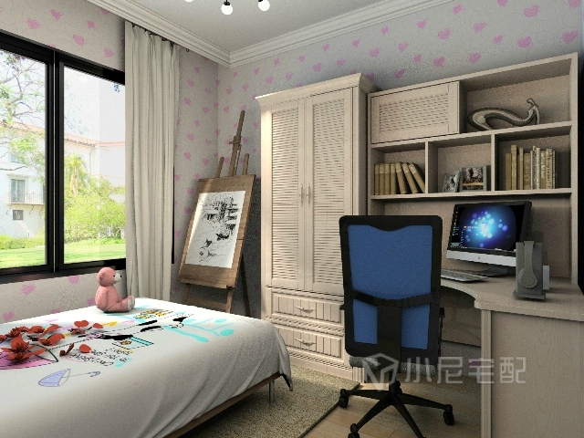 陽光從窗戶照射進來特別溫暖,屋里即可畫畫又可讀書查資料,衣柜下的抽屜可以放些自己喜愛的小東西,書桌可以讓孩子舒適的學習,真所謂麻雀雖小五臟俱全。