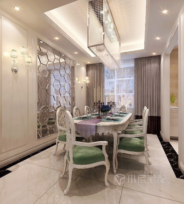 敞開式的廚房以及蜂窩狀的鏡面作為背景讓整個(gè)餐廳甚是寬敞明亮。桌旗與餐椅的搭配選用了搶眼的互補(bǔ)色,為整個(gè)空間添加活力。