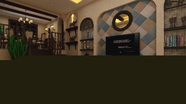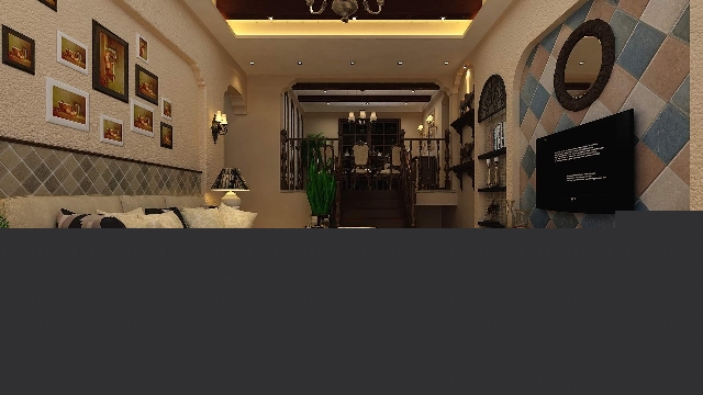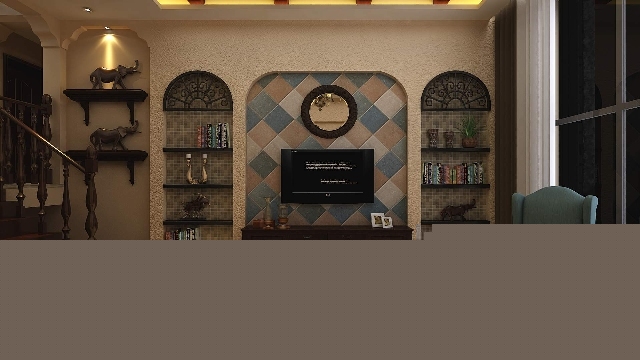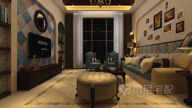 客廳 電視背景墻用藍、白、粉三色拼接而成,藍色的沙發(fā)墊巧妙呼應,