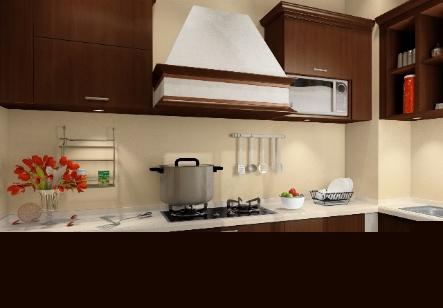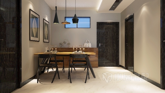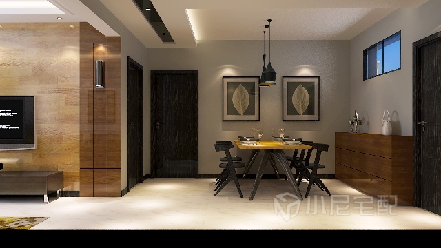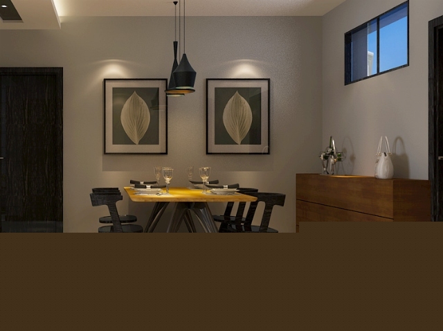 餐邊柜繼續保持木色和對稱和整體風格一致,而稍富有變化的餐桌和時尚的吊燈給人稍歡快的感覺。