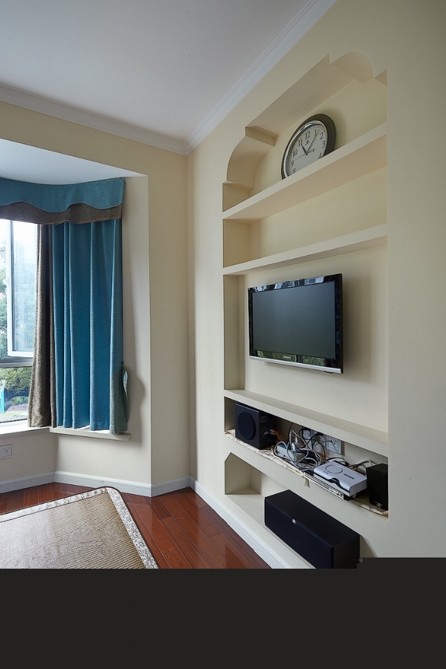 臥室簡約的電視背景墻,上面的架子還可以用來放書和小飾品奧。