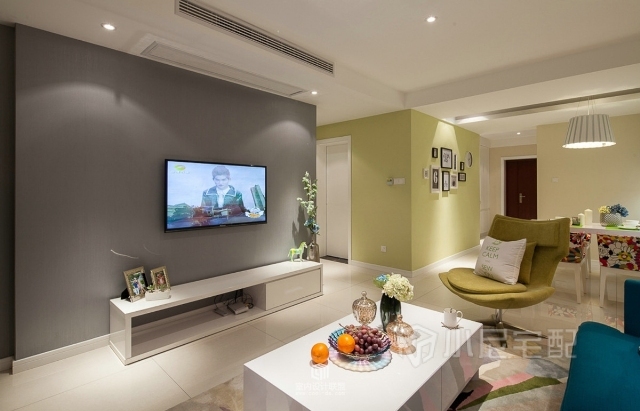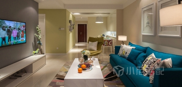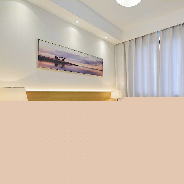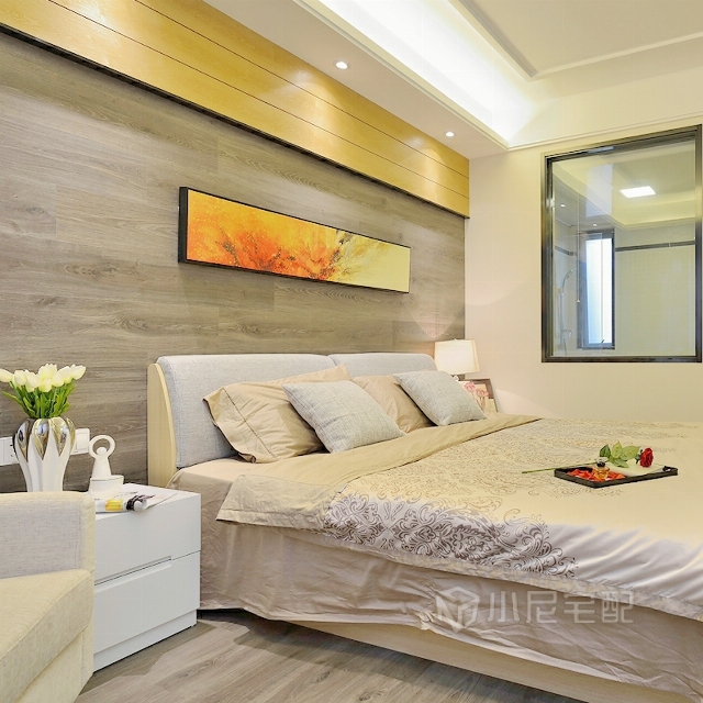 主臥的被套枕頭都是黃色的,很亮眼的顏色,墻體掛畫較為淺淡,和諧美好。