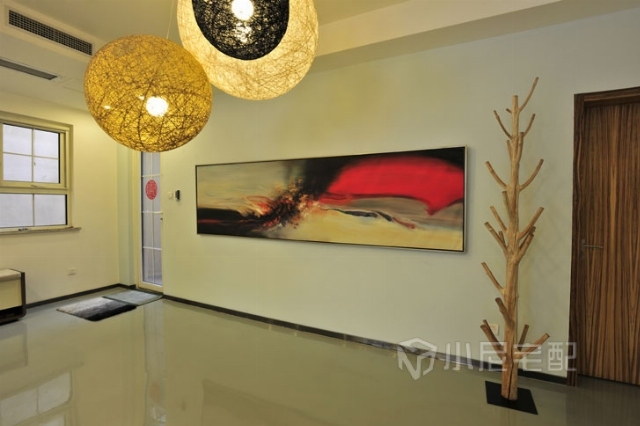 進門玄關的壁畫藝術感十足,與造型獨特的燈飾和掛衣架相呼應。