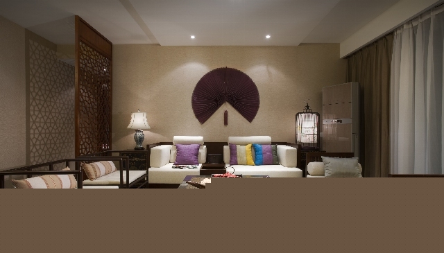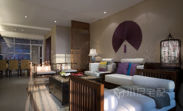 客廳的背景墻用扇形做的裝飾,十足的東南亞風。