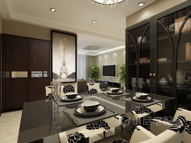 鏡面的餐桌和玻璃酒柜,高格調的就餐環境輕松彰顯,整體顏色與客廳相互配合,渾然一體。