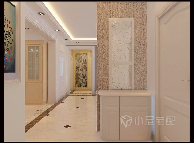 過道走廊明亮節儉,走廊盡頭以圖案馬賽克收尾,彰顯主人的審美感