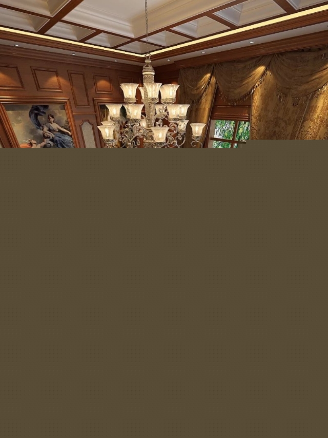 客廳頂部用大型燈池,有花紋的石膏線勾邊