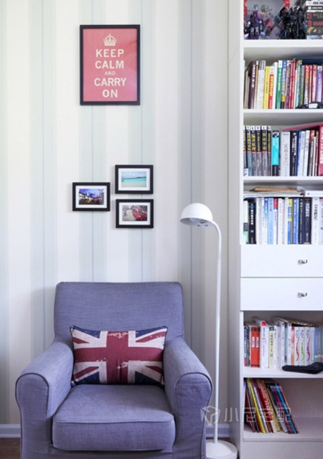 可愛的單人沙發上,有一個英倫味兒十足的小抱枕,墻上的裝飾畫別有趣味。小小的落地燈給蜷縮在沙發中慵懶閱讀的時光帶來了光亮。