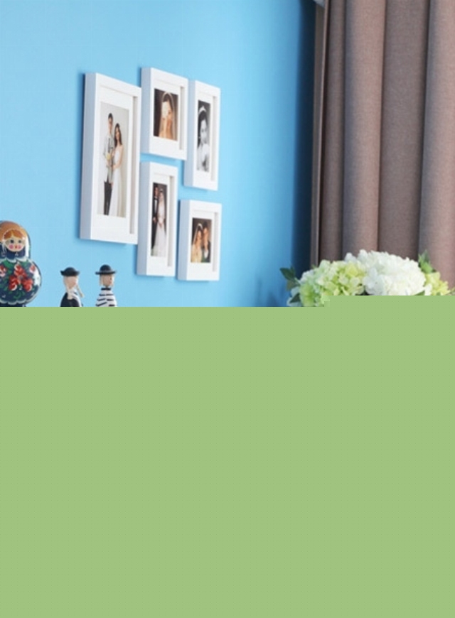 臥室里的一角。儲物柜上鋪了一塊小清新風格的桌旗,既防塵又美觀。桌面上的相框以及照片墻,無不體現著夫妻二人的感情甜蜜。