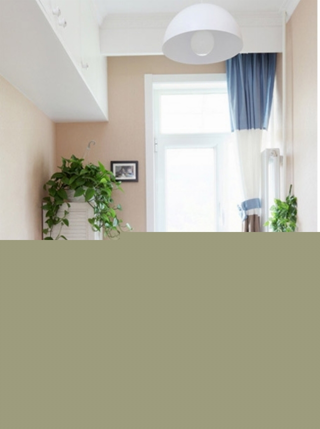 客廳與臥室只用了一扇紗簾來隔開,軟隔斷在保證隱私的前提下,也讓空間具有更好的連通性。粉刷了藍色墻漆的墻面顯得活潑溫雅,一排連續的儲物柜讓收納有了足夠的空間。