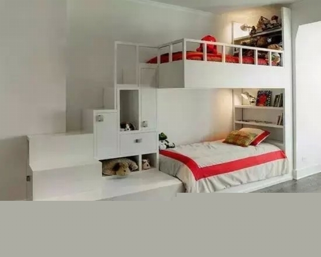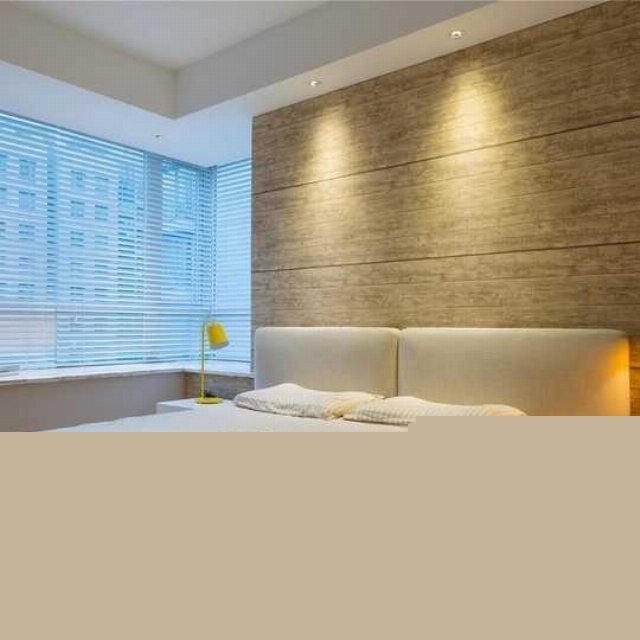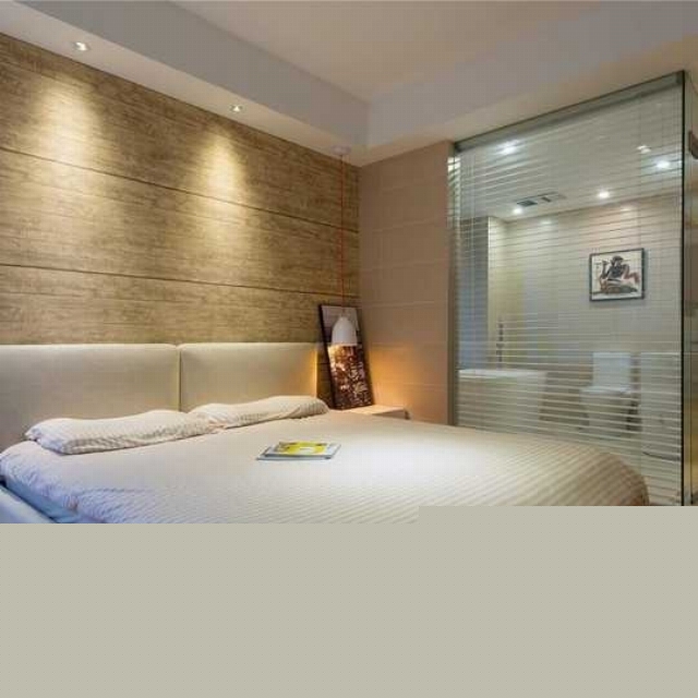 主臥木紋的墻紙灰色的涂料暖色的燈光通過最簡單的低成本去塑造一個沒有負擔的室內空間。
