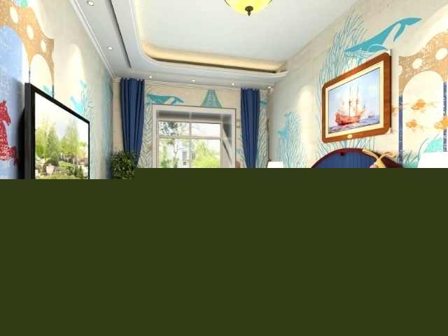 小兒子房間,藍(lán)色窗簾與藍(lán)色床頭和墻紙想呼應(yīng)。