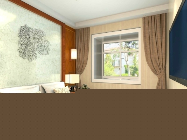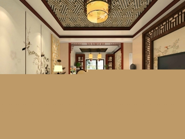 電視背景墻和吊頂都采用了中式花格,散發(fā)著濃郁的中式風(fēng)。