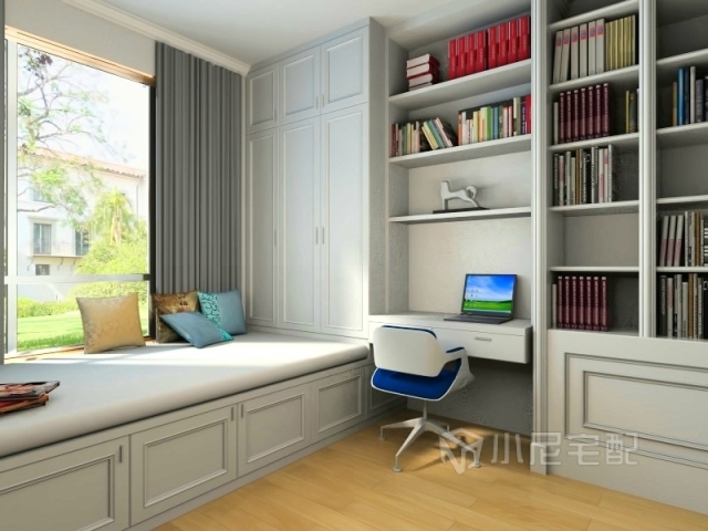 書房看起來整個空間簡單、舒適,書架的空間足夠容納下主人所有的書籍。整個立體形式都與有條不紊的、有節奏的曲線融為一體。以簡潔的造型、完美的細節,營造出時尚前衛的感覺。