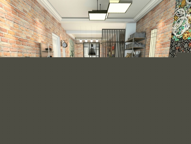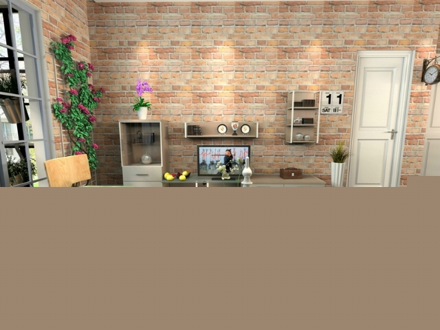 客廳墻面的板磚充滿氣氛感,布藝沙發和實木電視柜構成了復古風格的最佳搭配
