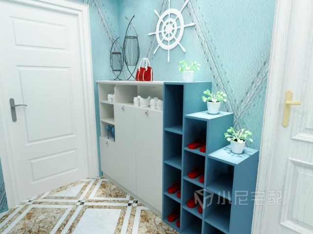 門廳鞋柜采用藍(lán)白色,開放柜和封閉柜結(jié)合,精巧的綠植擺設(shè)和墻飾突顯地中海風(fēng)格。