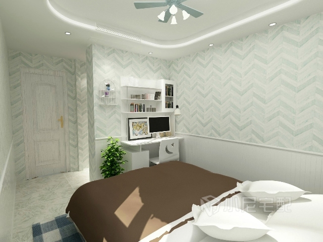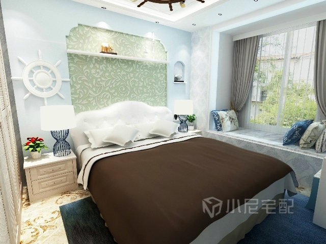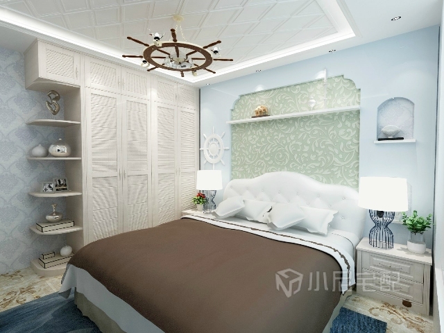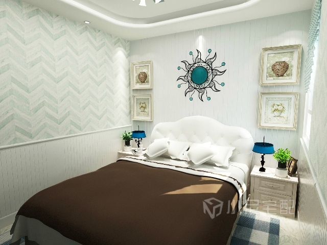 主臥:淺色的小尼家具,地中海風(fēng)格的燈和墻飾,精致的綠植,從整體到細(xì)節(jié)無一不透出溫馨浪漫之感。