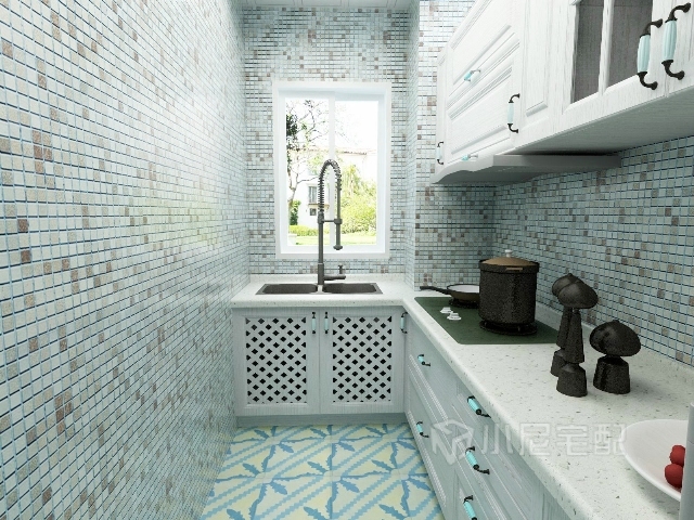 白色天花板吊頂,搭配馬賽克墻面和瓷磚拼花地面,帶來一股明媚田園氣息。淡雅的藍(lán)白色的結(jié)合,仿佛將人帶入大海世界中,將廚房映襯的明媚動(dòng)人。