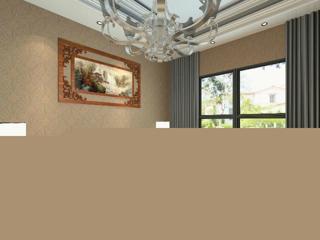 這個客廳大量使用碎花圖案的各種布藝和掛飾,歐式家具華麗的輪廓與精美的吊燈相得益彰。