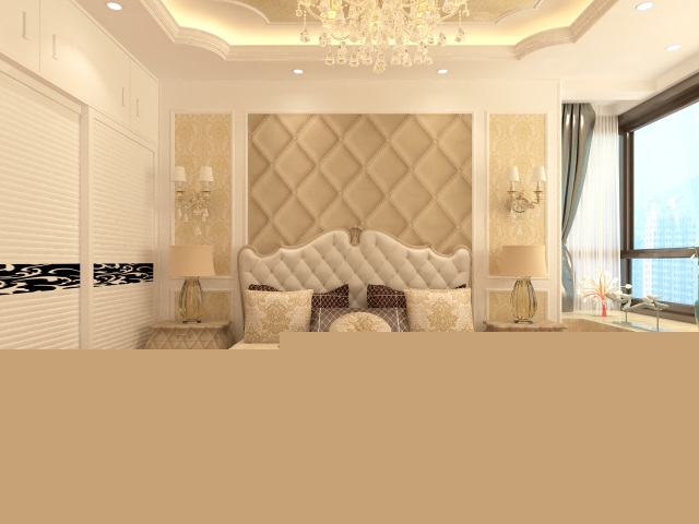 主臥室背景墻用軟包和壁布搭配,配飾壁燈如果到了晚上別有一番情調