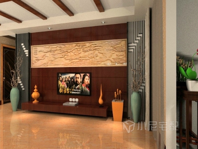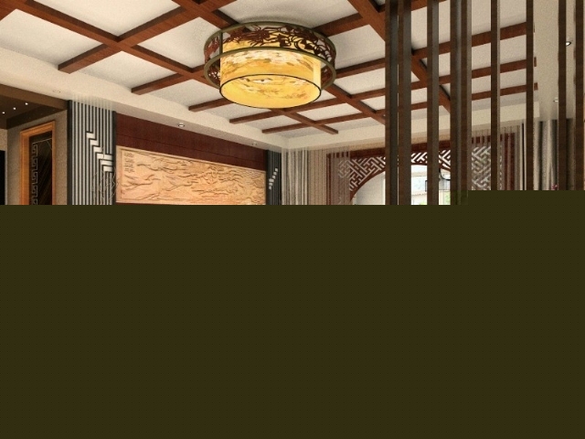 木質橫梁與格柵的中國元素運用到吊頂,電視墻,以及隔斷