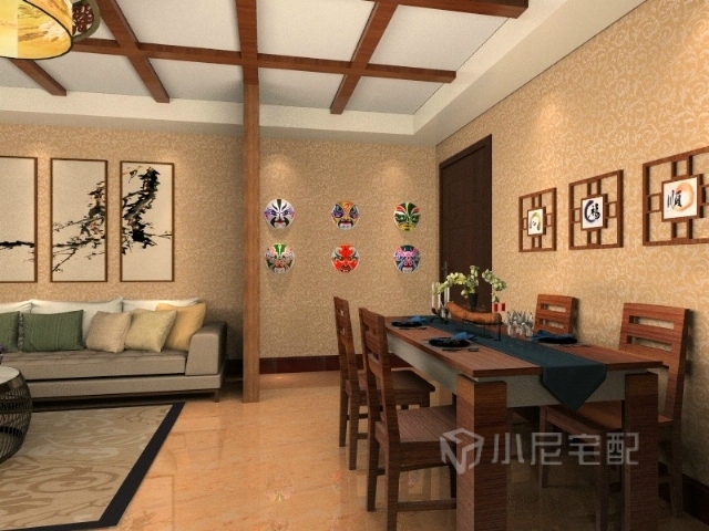 餐廳采用小尼中國胡桃色系,使餐廳在材質上更具中國色彩