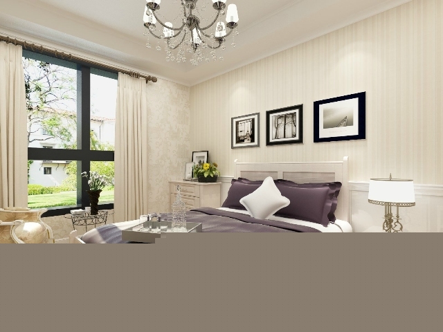 護墻板裝飾床頭背景墻,搭配黑白裝飾畫使臥室不再單調。