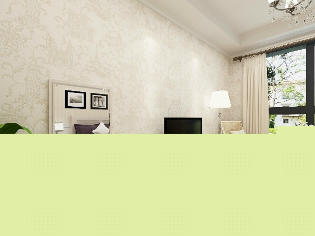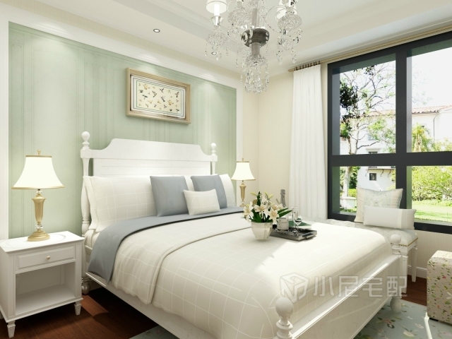 淡綠色的臥室背景墻,潔白的窗簾,給臥室營造一種嫻靜和清新的感覺。