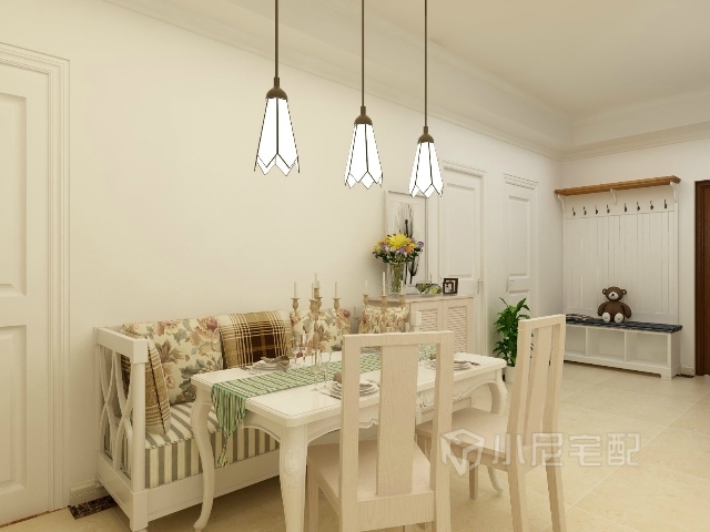 淡黃色碎花的卡座配上歐式的餐桌椅,餐廳部分顯得溫馨又舒適。