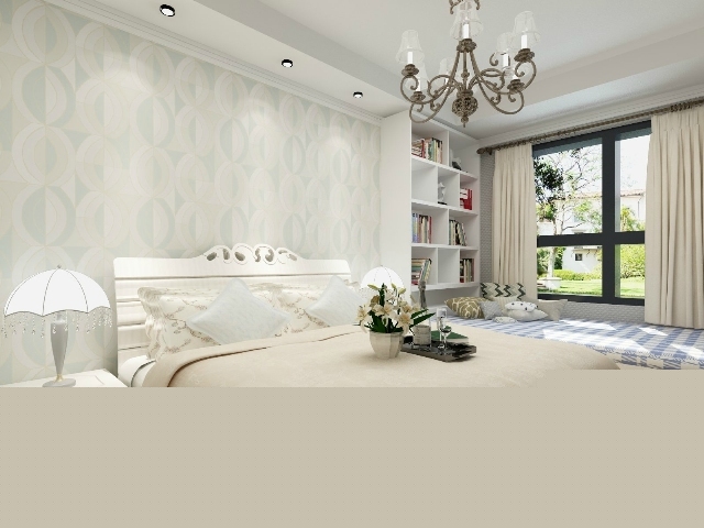 淡綠色花紋壁紙增加了時尚感,優美的花紋,鐵藝的吊燈,增加了臥室的古典氣息。