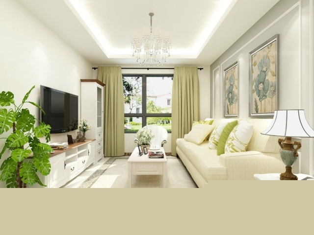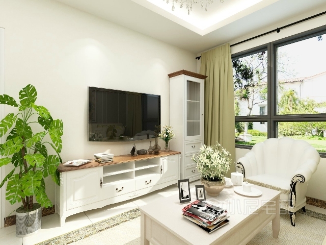 白色田園風格的電視柜組合,綠色的植物增加整個空間的活力。