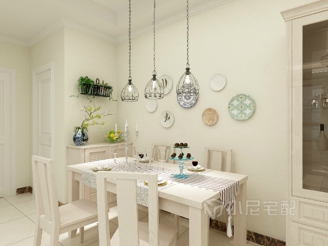 鐵藝長線吊燈,白色橡木的餐桌椅,表現出悠閑,舒暢,自然的田園生活情趣。