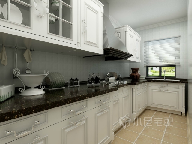 白色的櫥柜,淡藍色方格墻磚,黃色地磚,彰顯著輕松,隨性的生活態度