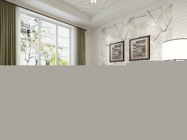 床頭墻選用葉子圖案的裝飾墻搭配草綠色的窗簾,增加自然的清爽的情調。