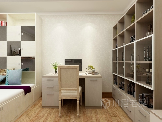 將臥室改造成榻榻米加書房,休閑與工作結合,大面積的書柜,讓家顯得井然有序。