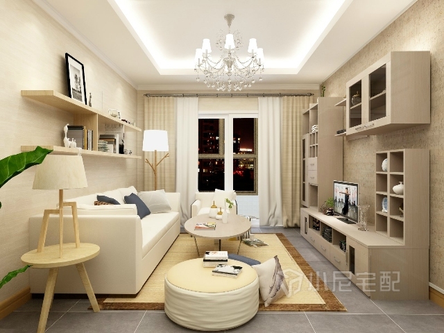 深灰色的地磚搭配暖黃色的地毯,顯得十分溫馨。定制的電視柜組合增加了儲物功能。