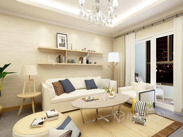白色沙發,幾個抱枕的點綴,沙發上增加壁架放置一些小物件小裝飾,達到空間的很好的利用。