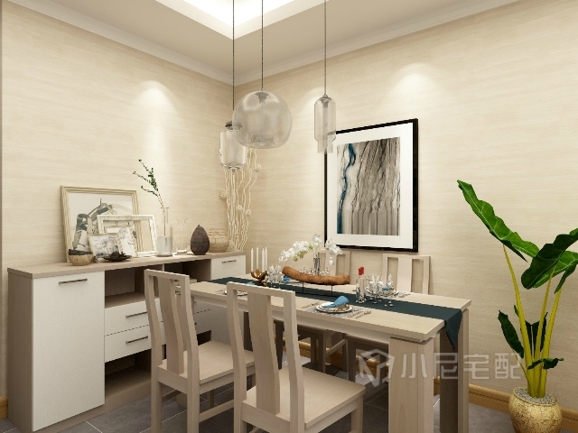 卡米楓木加白橡套色的餐邊柜,綠植,吊燈,整體展現出現代,時尚的設計理念。