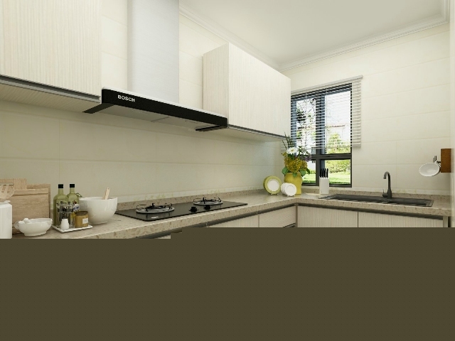 白橡實木櫥柜搭配石英石的臺面,造型簡約,功能齊全。