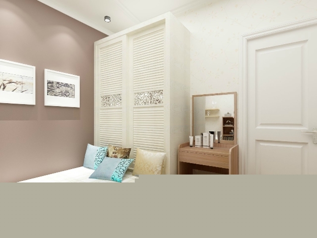 淡褐色的墻紙搭配現代裝飾畫,定制榻榻米加衣柜使整個房間一下就多出幾平米的利用空間。