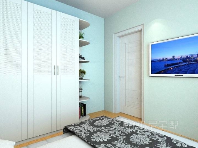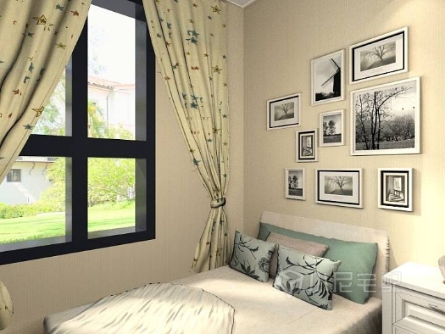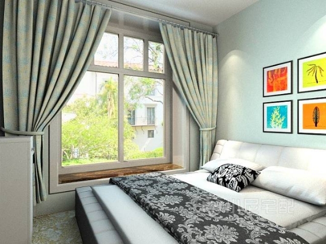 窗簾、床罩用印花布。一些綠色植物的襯托,使居室充滿愜意、輕松氣氛。