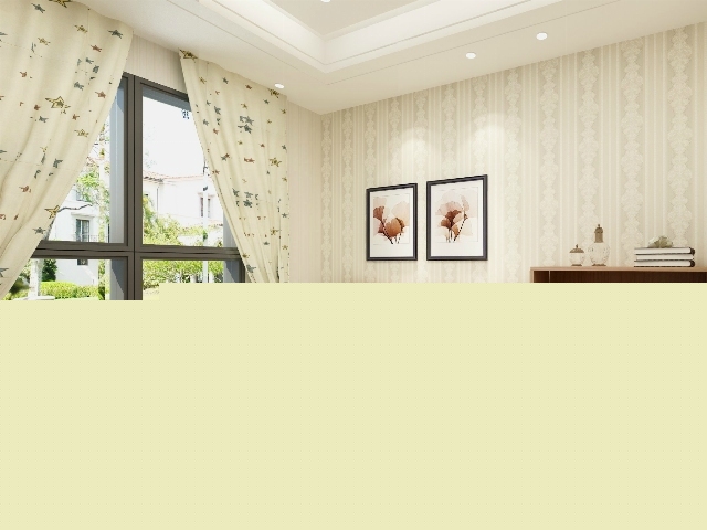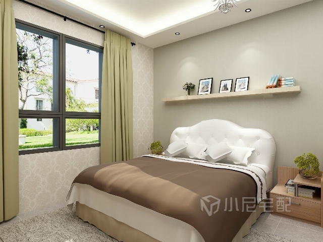用草綠色的窗簾和床頭灰綠色的墻面相呼應,舒適的軟床盡顯臥室的柔軟舒適。