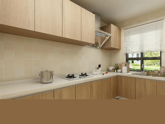 廚房選用原木的櫥柜組合,白色的石英石臺面,簡約時尚。