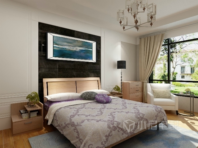 臥室的裝飾也十分簡單,個性的背景墻,落地窗前的屜柜和沙發打造舒適的休閑區。