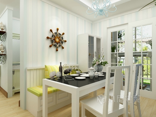 融入鮮艷的綠色,給人視覺的新意。墻上的地中海掛件,藍色的壁紙,給人清涼自然的感覺。